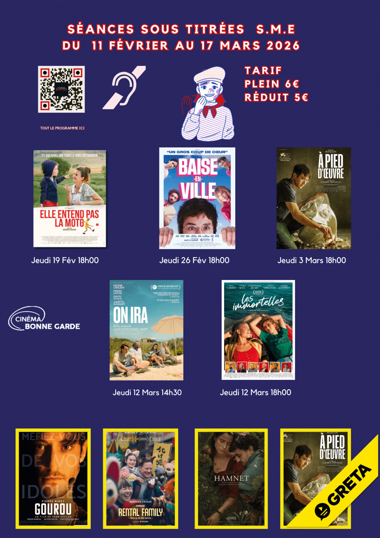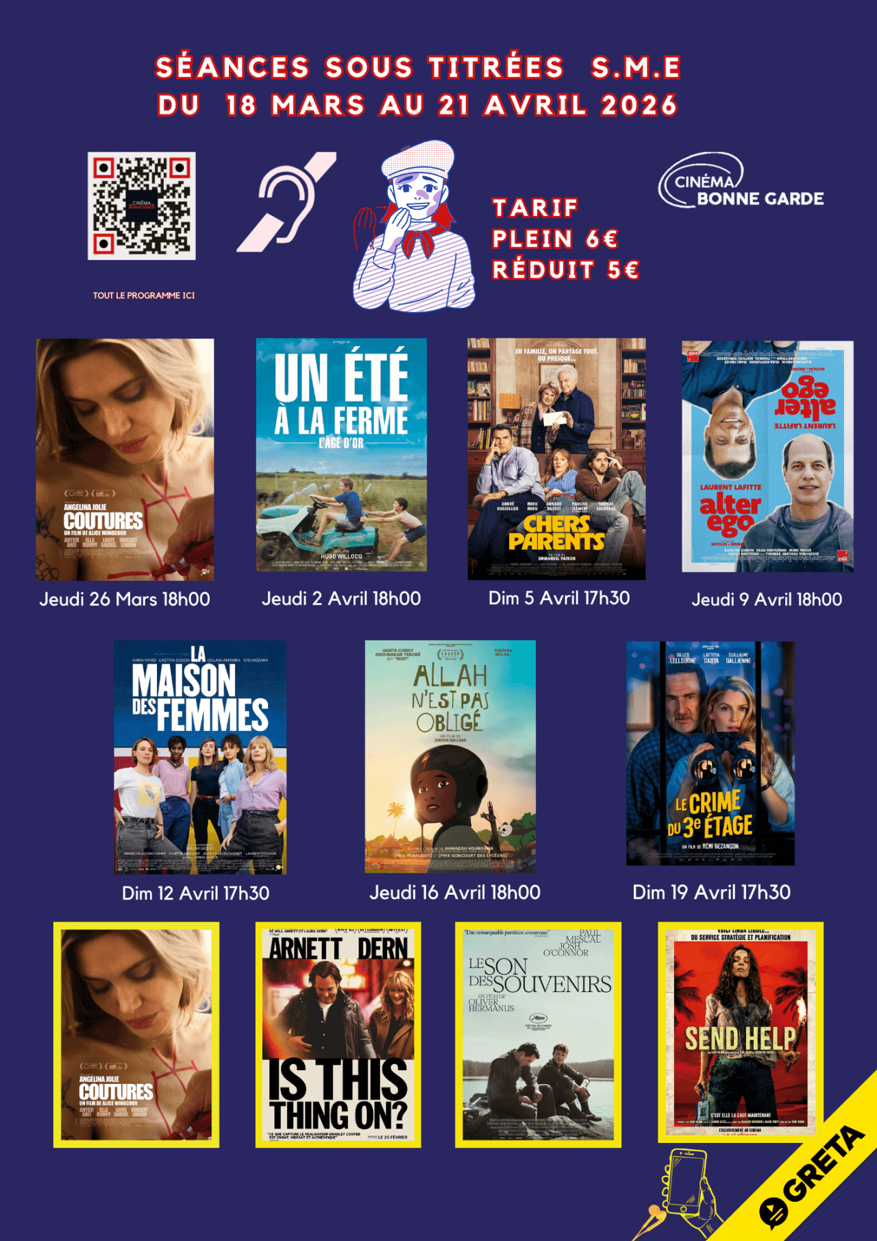 Notre cinéma propose la solution GRETA pour les spectateurs malentendants et malvoyants, offrant audiodescription, sous-titres et amplification sonore de certains films pour une expérience inclusive.